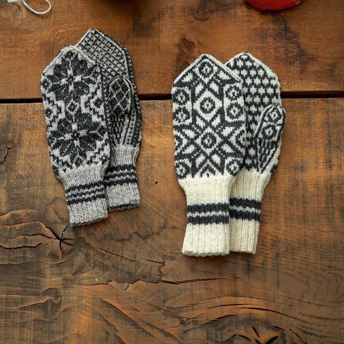 Strikket vanter i meilenweit 50 (de lysegrå og mørkegrå vanter på billedet til venstre)